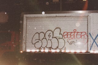 I walk around my community at night, in the summer, taking pictures of graffiti, storefronts, bikers, signs, flyers.